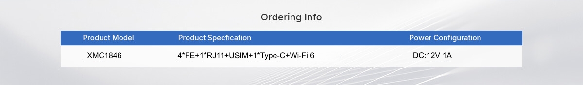 3FE*LAN Port+ 1*FE WAN/LAN Port, 1 x Type C Port, 1 x RJ11 Port, 1 x SIM Card (4FF nano), 1 x DC Power Supply (12V/1A)